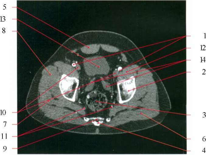1) общие бедренные артерии; 2) головка бедренной кости; 3) прямая кишка; 4) копчик; 5) прямая мышца живота; 6) большая ягодичная мышца; 7) малая ягодичная мышца; 8) общая бедренная вена: 9) подвздошно-поясничная мышца; 10) мочевой пузырь; 11) семенные пузырьки; 12) седалищная кость; 13) внутренняя запирательная мышца; 14) портняжная мышца.