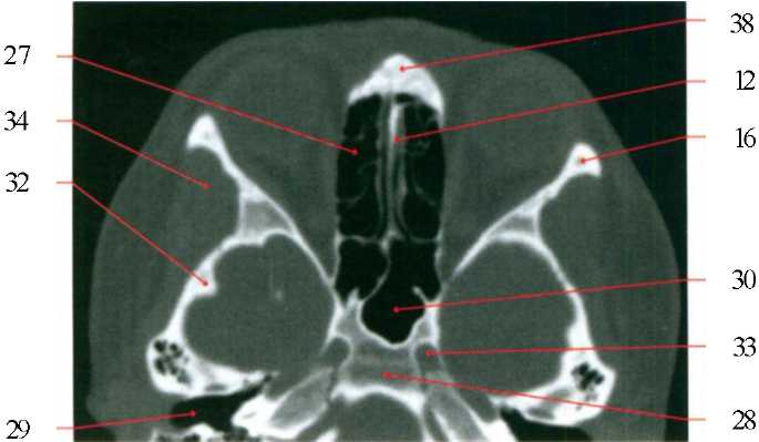 12) носовая перегородка; 16) скуловая кость; 27) ячейки решетчатого лабиринта; 28) скат; 29) наружный слуховой проход; 30) клиновидная (основная) пазуха; 32) клиновидная (основная) кость; 33) сонная артерия; 34) височная мышца; 38) носовая часть лобной кости.