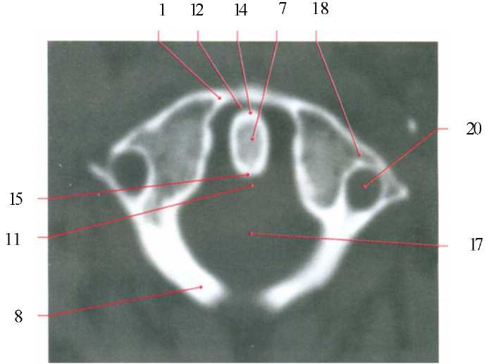 3) ветвь нижней челюсти; 5) жевательная мышца; 6) медиальная крыловидная мышца; 10) латеральная крыловидная мышца; 11) носоглотка; 12) носовая перегородка; 13) верхнечелюстная пазуха; 14) нижняя носовая раковина; 16) скуловая кость; 17) латеральная пластинка крыловидного отростка; 18) медиальная пластика крыловидного отростка.
