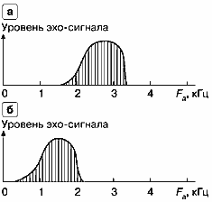 В эхо-сигналах, отраженных движущимися структурами, появляется допплеровский сдвиг частоты, т.е. частота эхо-сигналов изменяется относительно частоты сигнала, отражаемого неподвижными структурами (рис. 34).