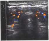 · Иногда обнаруживаются гипоэхогенные или анэхогенные округлые очаги, указывающие на формирование абсцесса. В данном случае щитовидная железа крайне болезненна при надавливании датчиком, имеет гладкие контуры и содержит грубые внутренние эхо-сигналы.